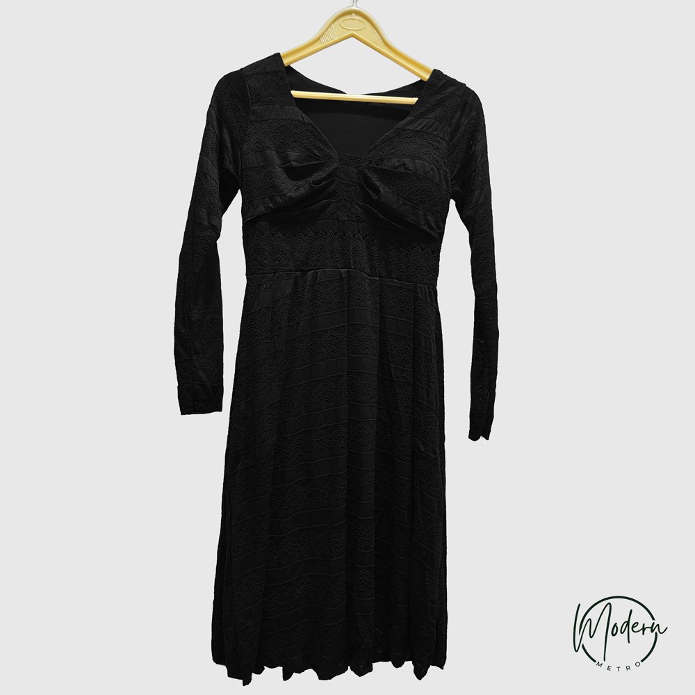Step into timeless elegance with this Women’s Black Long-Sleeve Midi Dress, crafted to give you a chic and flattering look for every occasion. Designed with a soft, patterned texture and a feminine knot-style bust detail, this dress blends comfort with modern sophistication.